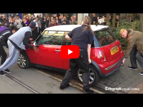 Group of men lift Mini blocking tram in Nottingham view map location